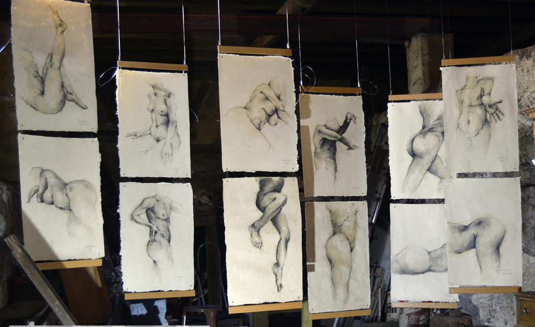 Japanpapier wird mit hartem Graphitstift gezeichnet. Es entstehen schnell